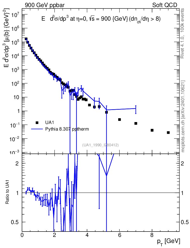 Lines: data, pythia8 8.307 pptherm |