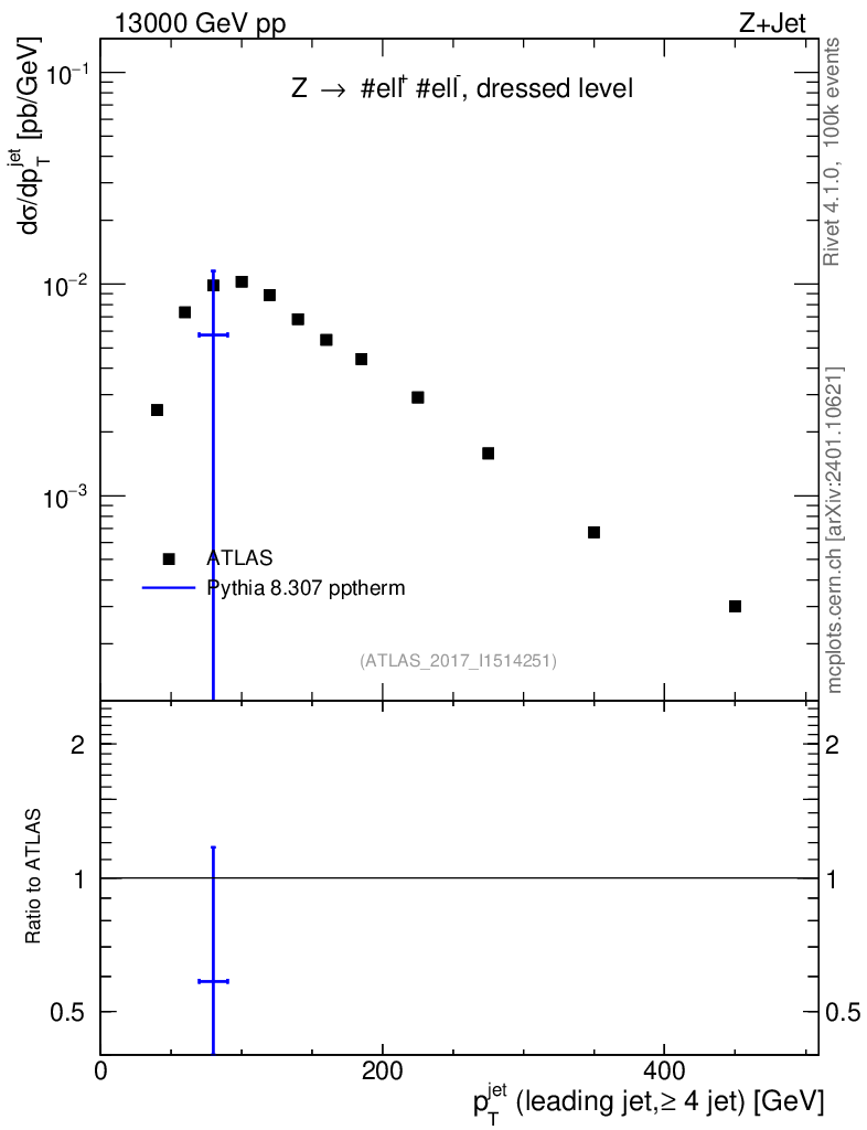 Lines: data, pythia8 8.307 pptherm |