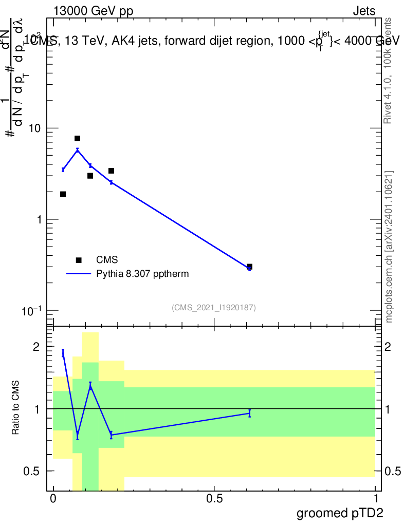 Lines: data, pythia8 8.307 pptherm |