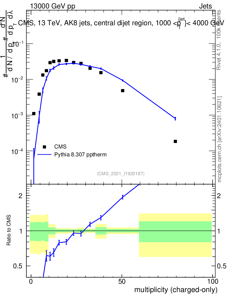 Lines: data, pythia8 8.307 pptherm |