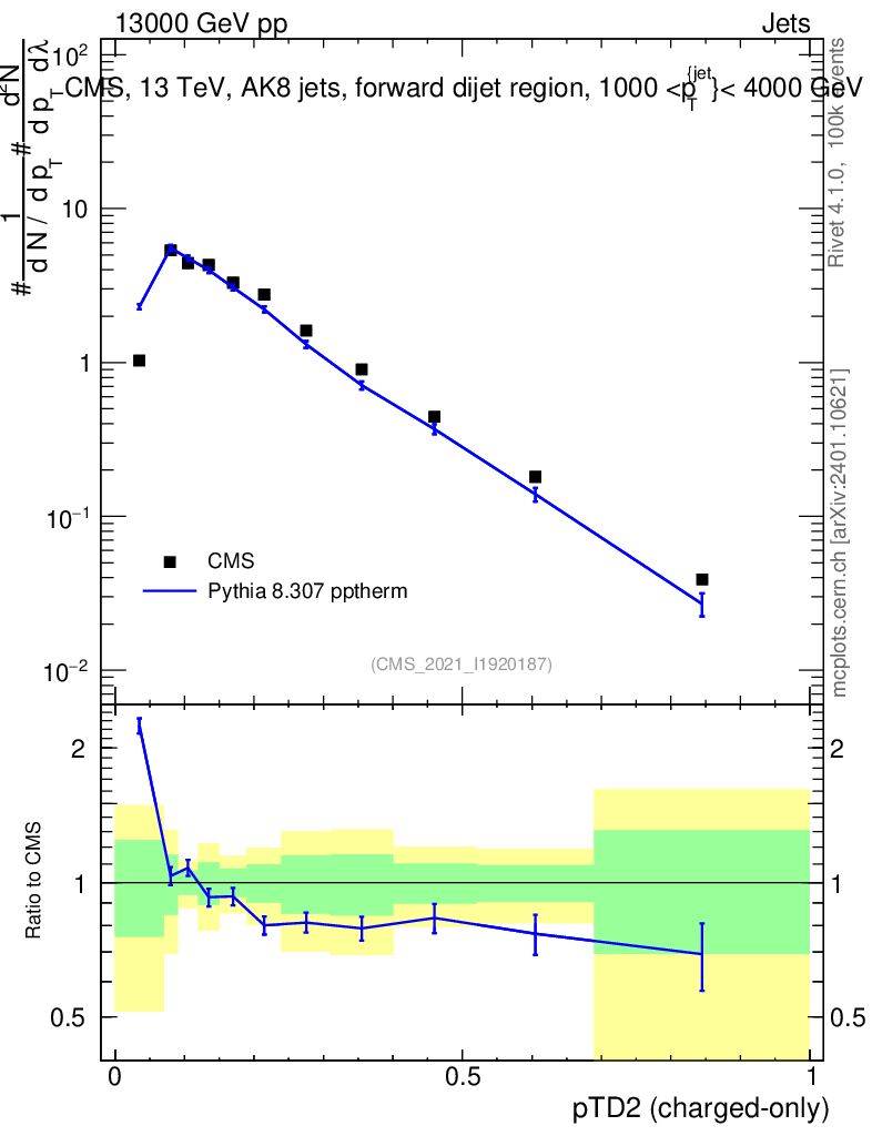 Lines: data, pythia8 8.307 pptherm |