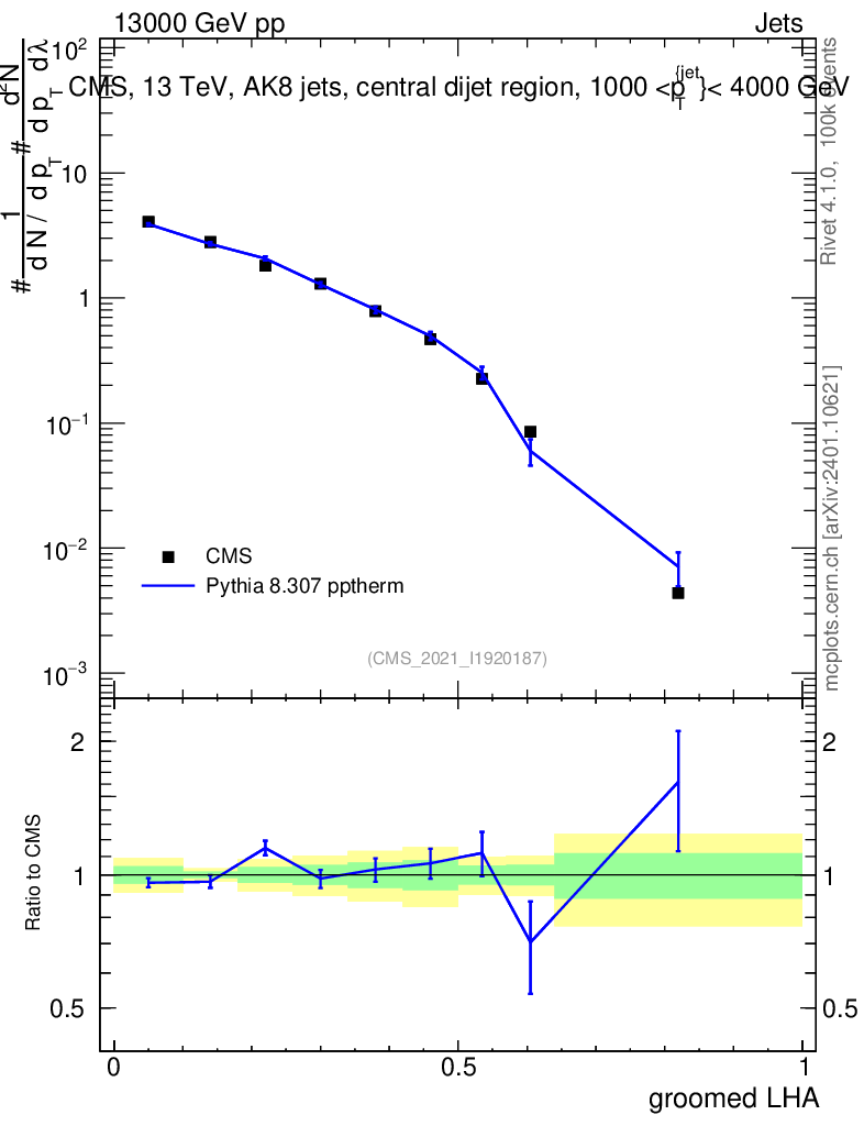 Lines: data, pythia8 8.307 pptherm |