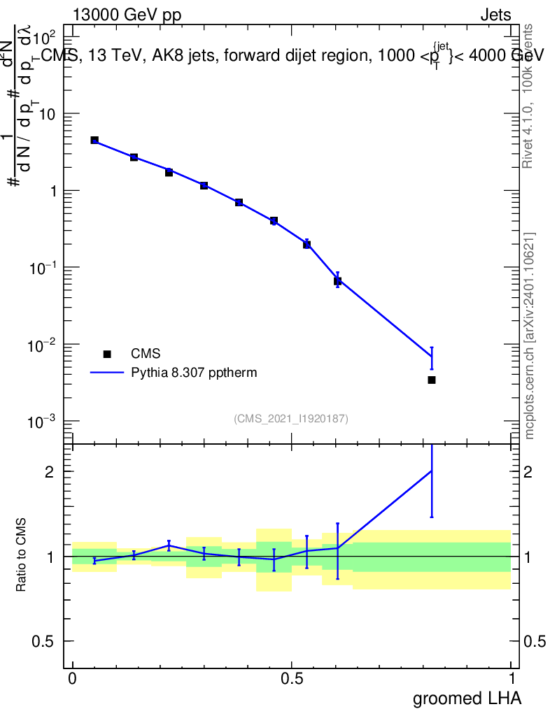 Lines: data, pythia8 8.307 pptherm |