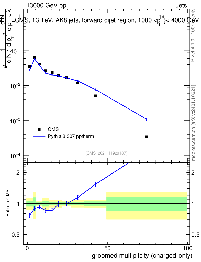 Lines: data, pythia8 8.307 pptherm |