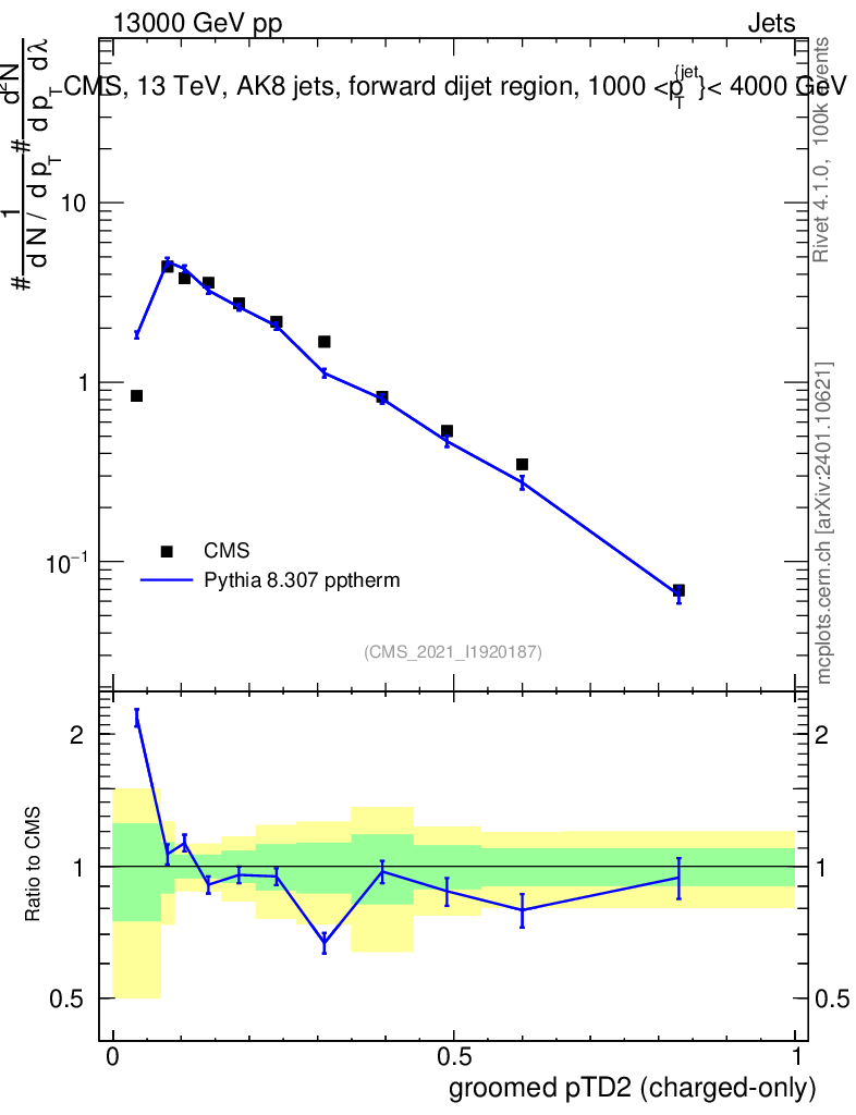 Lines: data, pythia8 8.307 pptherm |