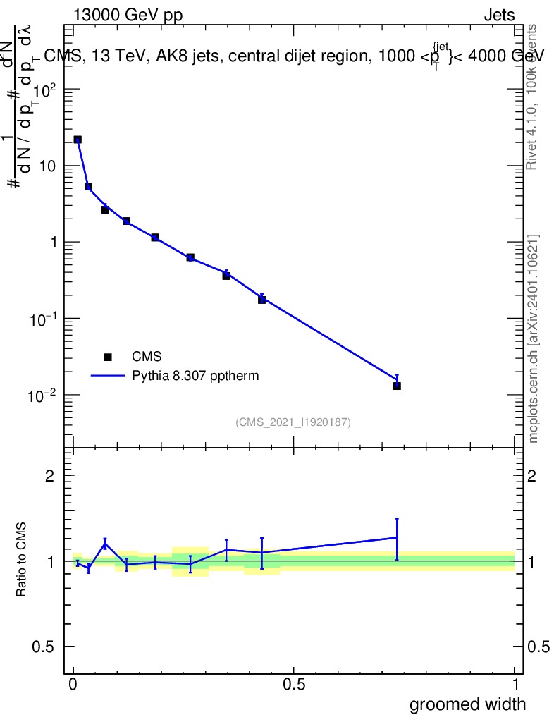 Lines: data, pythia8 8.307 pptherm |