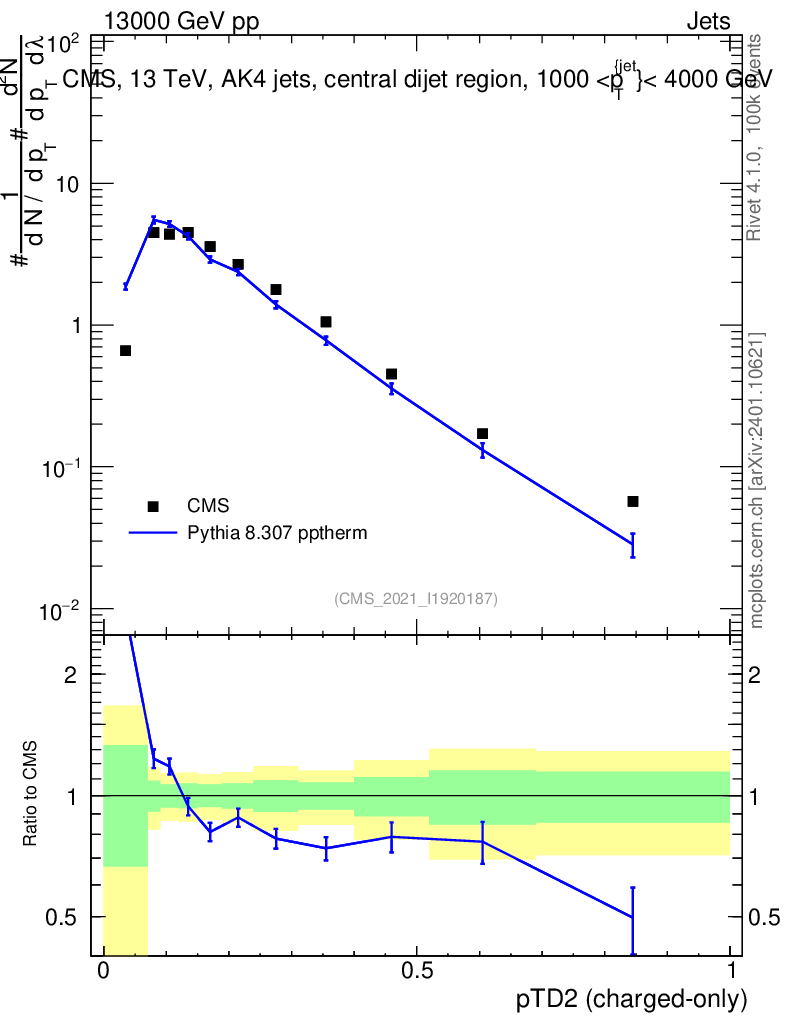 Lines: data, pythia8 8.307 pptherm |