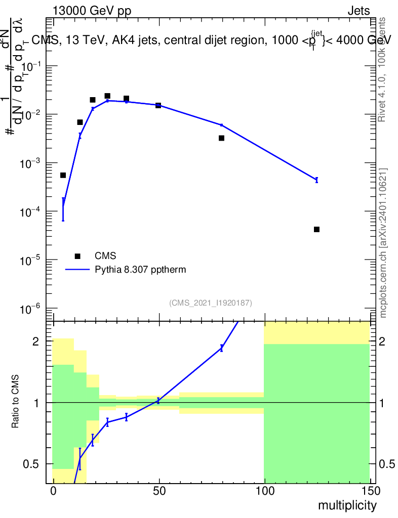 Lines: data, pythia8 8.307 pptherm |