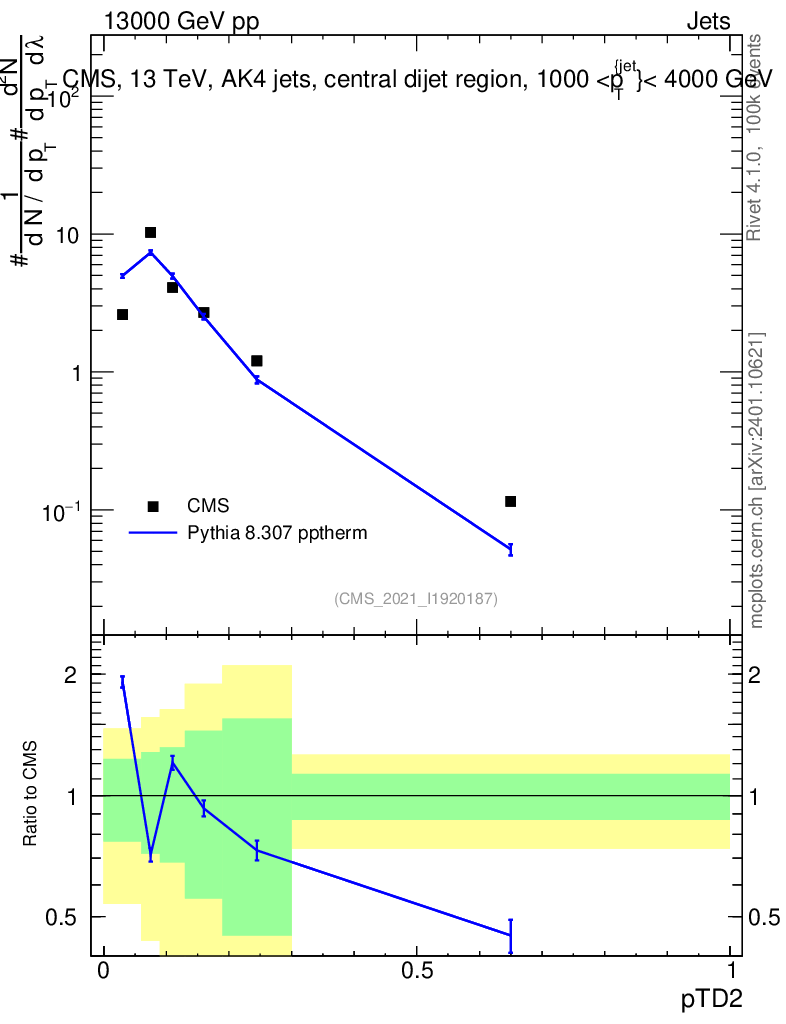 Lines: data, pythia8 8.307 pptherm |