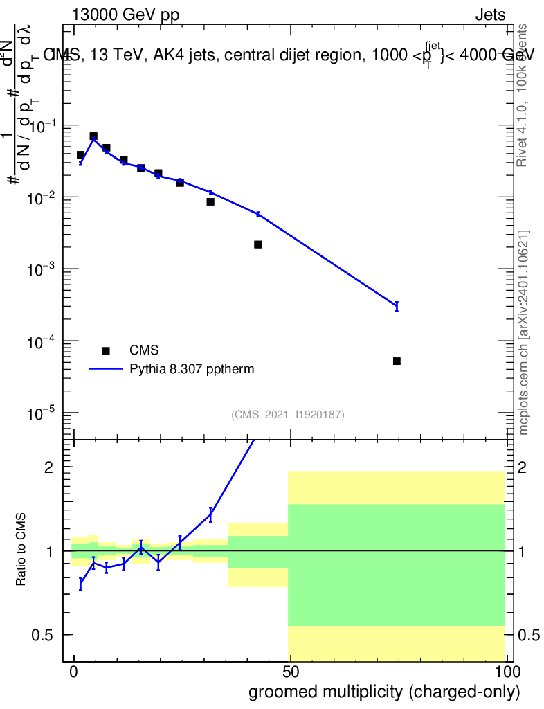 Lines: data, pythia8 8.307 pptherm |