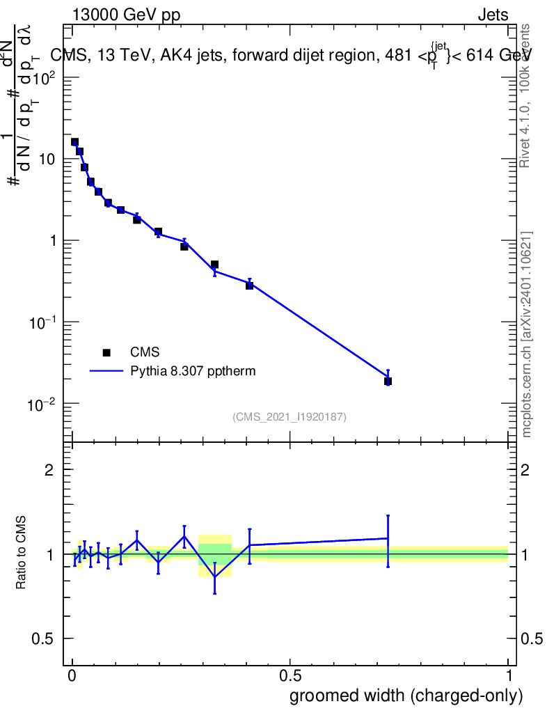 Lines: data, pythia8 8.307 pptherm |