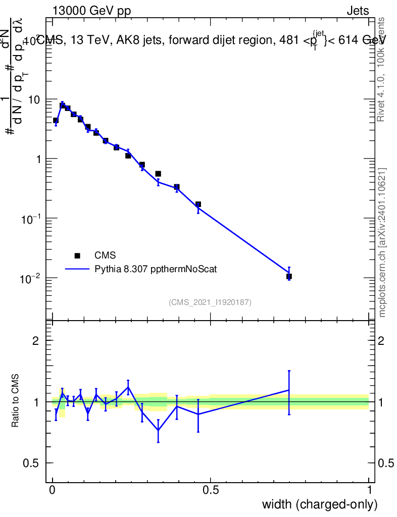Lines: data, pythia8 8.307 ppthermNoScat |