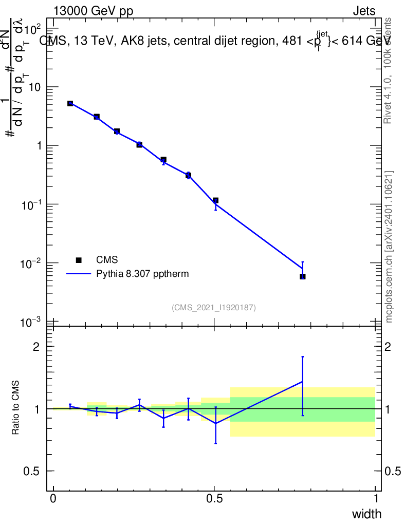 Lines: data, pythia8 8.307 pptherm |