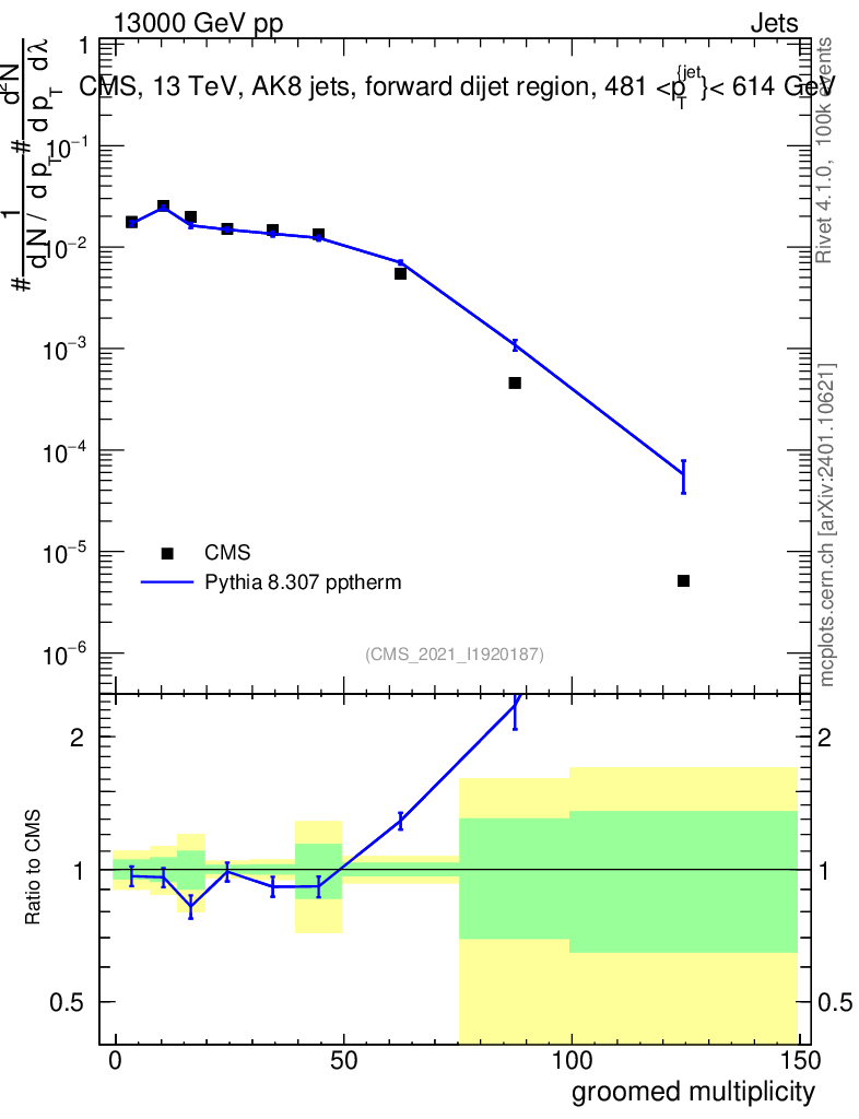 Lines: data, pythia8 8.307 pptherm |