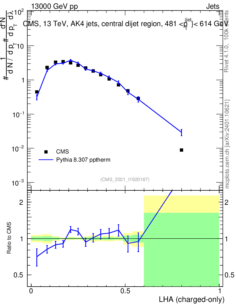 Lines: data, pythia8 8.307 pptherm |