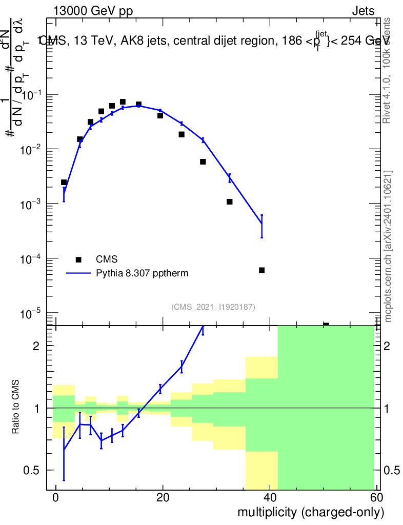 Lines: data, pythia8 8.307 pptherm |