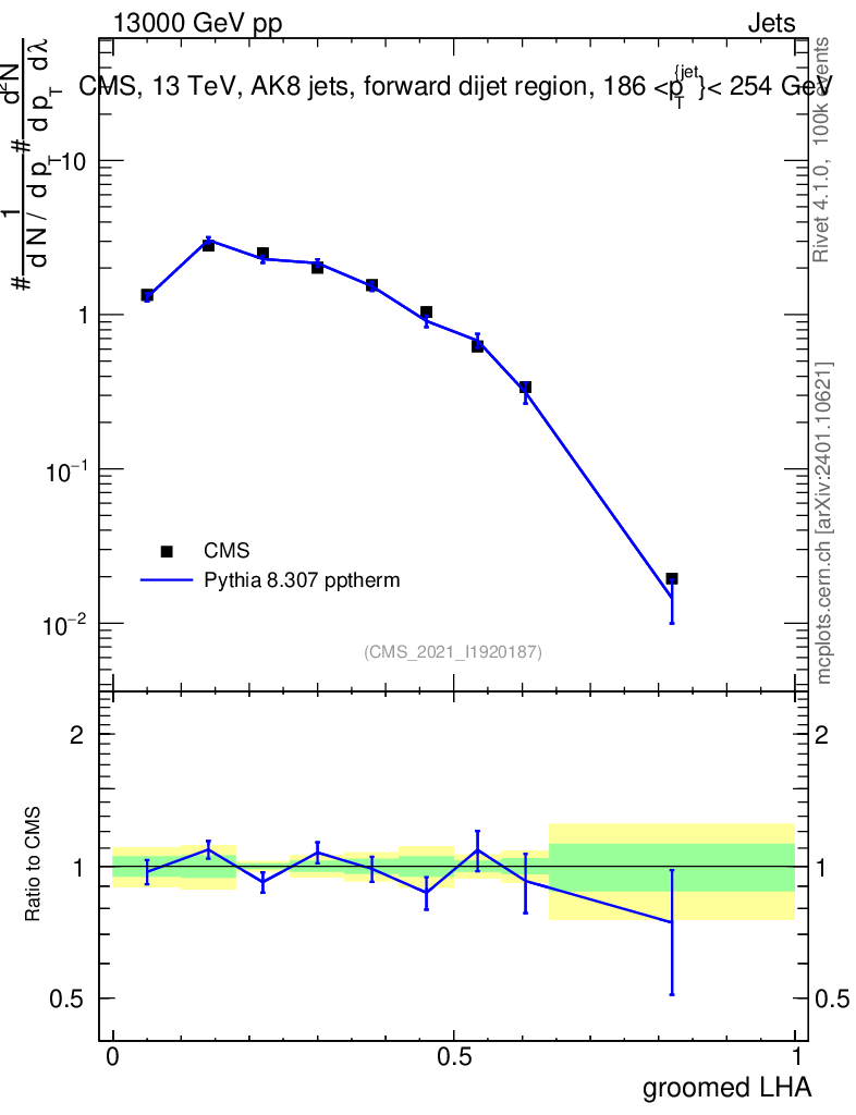 Lines: data, pythia8 8.307 pptherm |