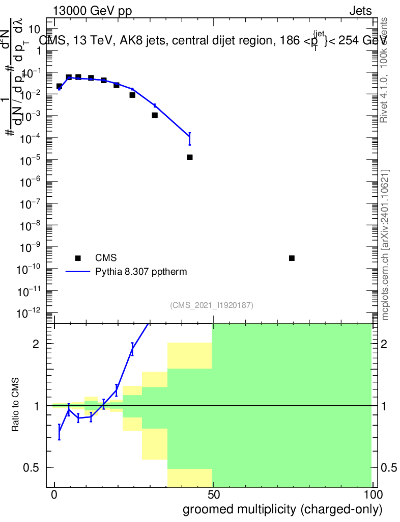 Lines: data, pythia8 8.307 pptherm |