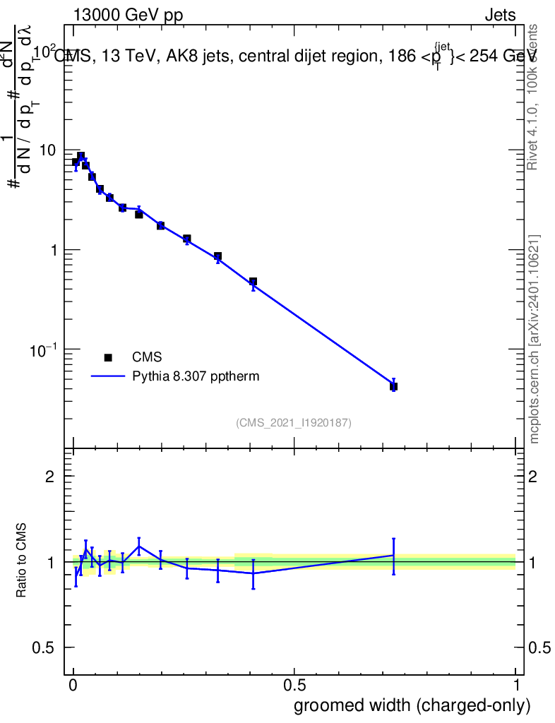 Lines: data, pythia8 8.307 pptherm |