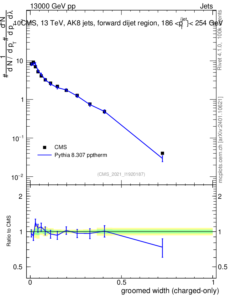 Lines: data, pythia8 8.307 pptherm |