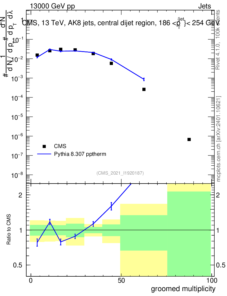 Lines: data, pythia8 8.307 pptherm |