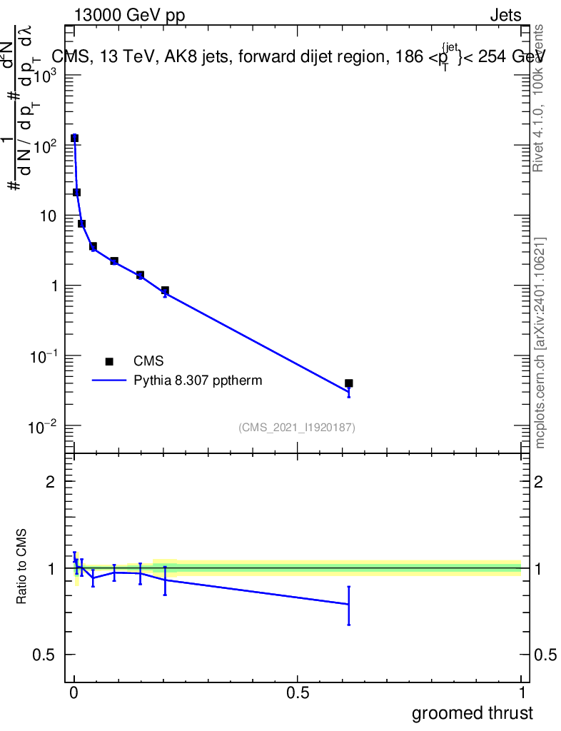 Lines: data, pythia8 8.307 pptherm |