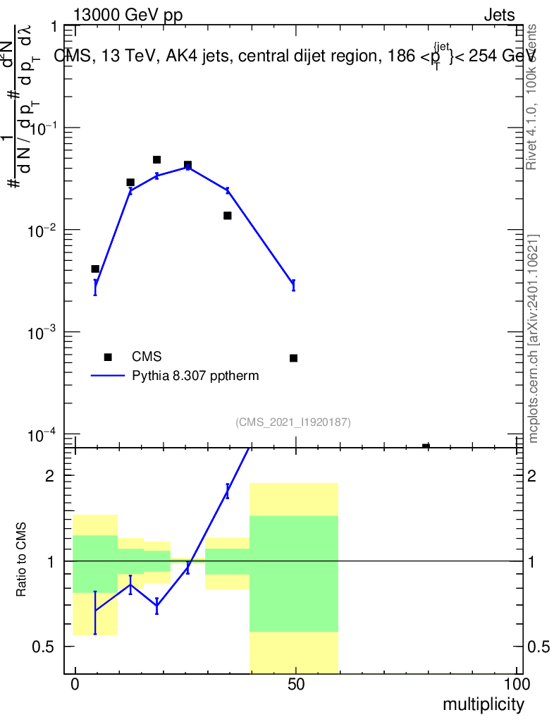 Lines: data, pythia8 8.307 pptherm |