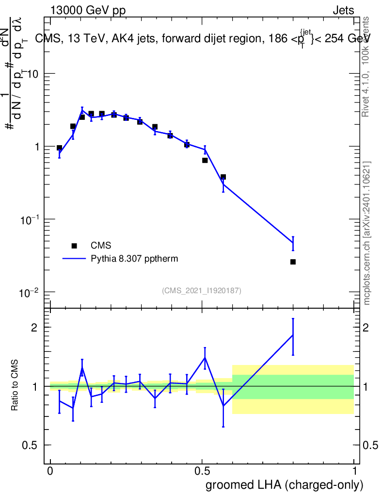 Lines: data, pythia8 8.307 pptherm |