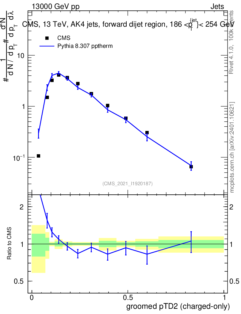 Lines: data, pythia8 8.307 pptherm |