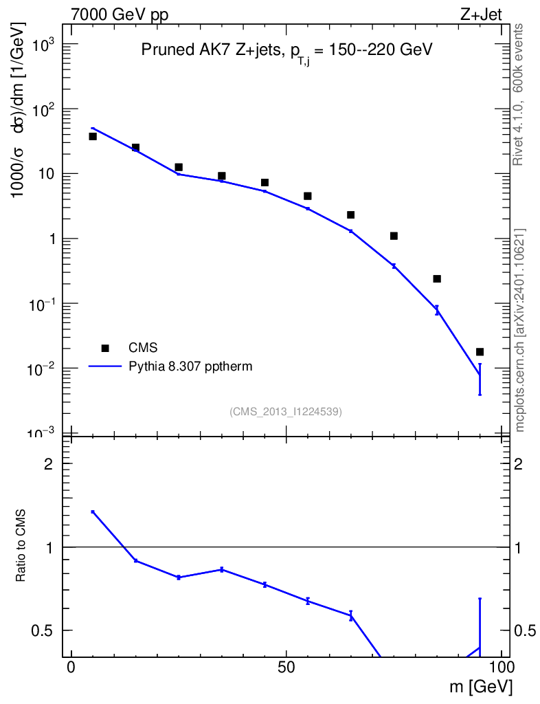 Lines: data, pythia8 8.307 pptherm |