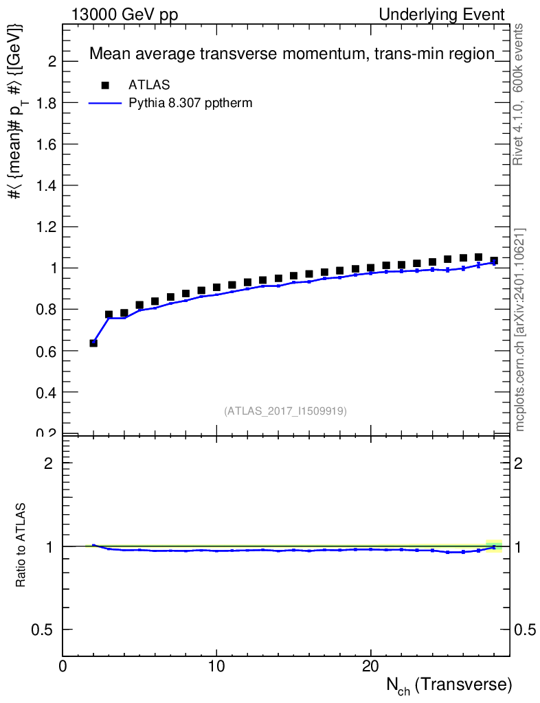 Lines: data, pythia8 8.307 pptherm |