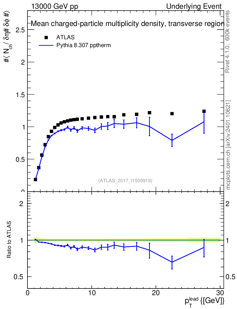 Lines: data, pythia8 8.307 pptherm |