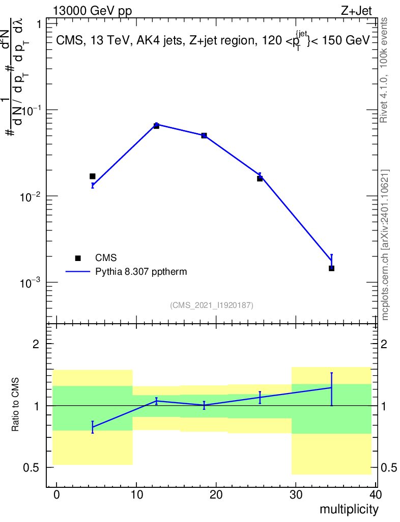 Lines: data, pythia8 8.307 pptherm |
