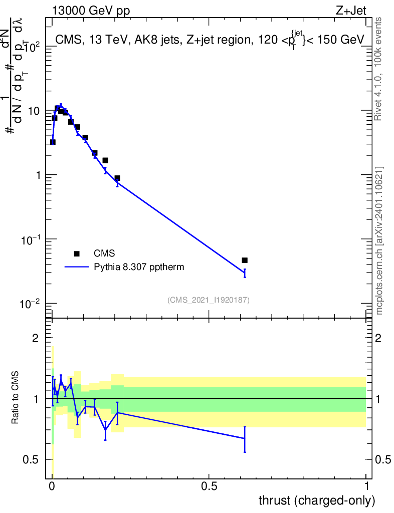 Lines: data, pythia8 8.307 pptherm |