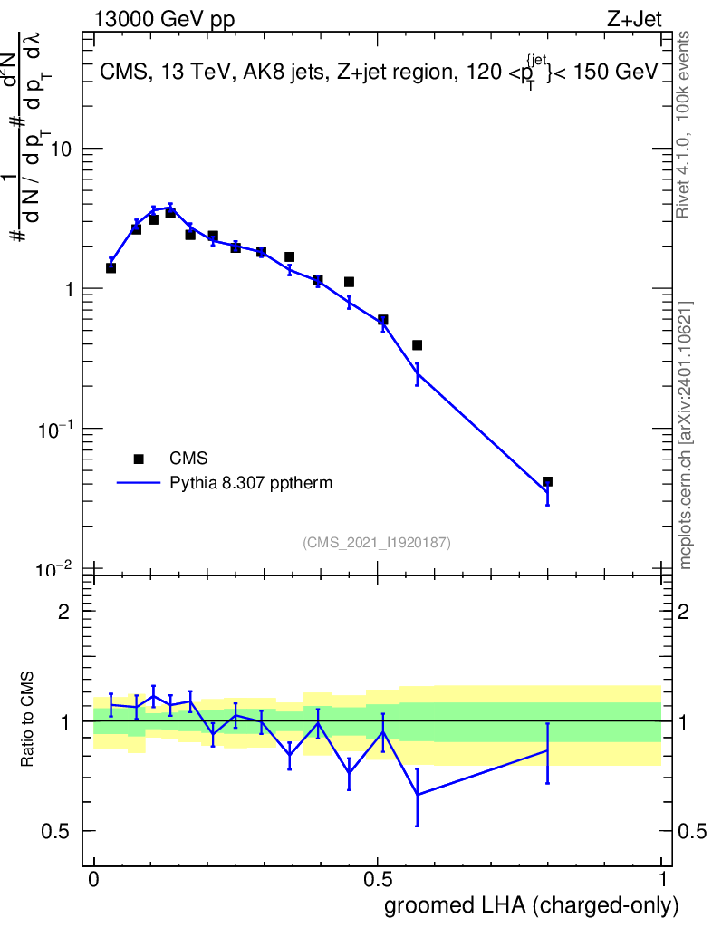 Lines: data, pythia8 8.307 pptherm |