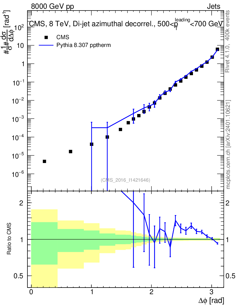 Lines: data, pythia8 8.307 pptherm |