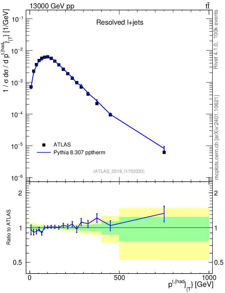 Lines: data, pythia8 8.307 pptherm |