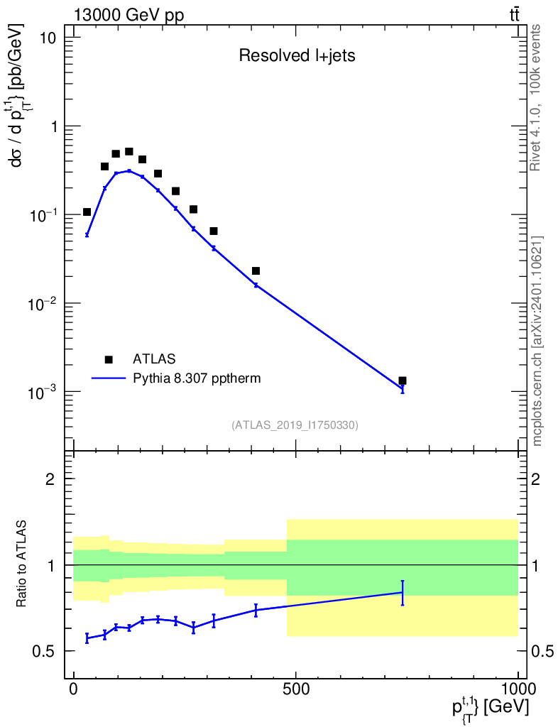 Lines: data, pythia8 8.307 pptherm |