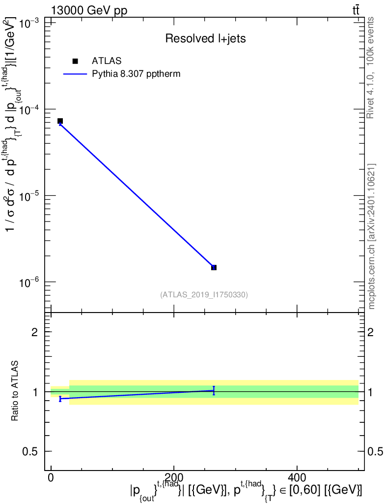 Lines: data, pythia8 8.307 pptherm |