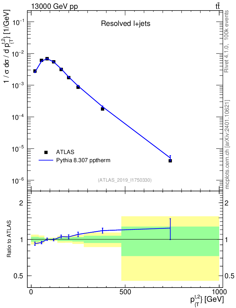 Lines: data, pythia8 8.307 pptherm |