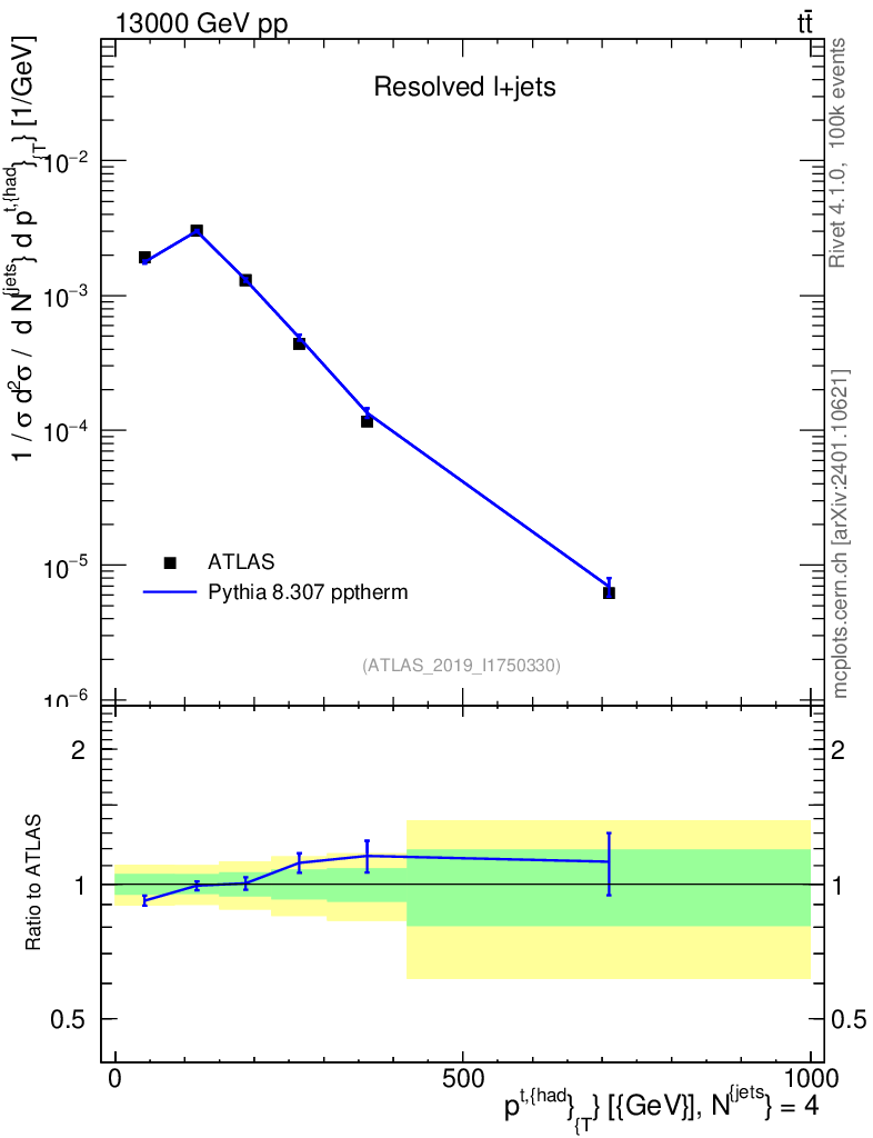 Lines: data, pythia8 8.307 pptherm |