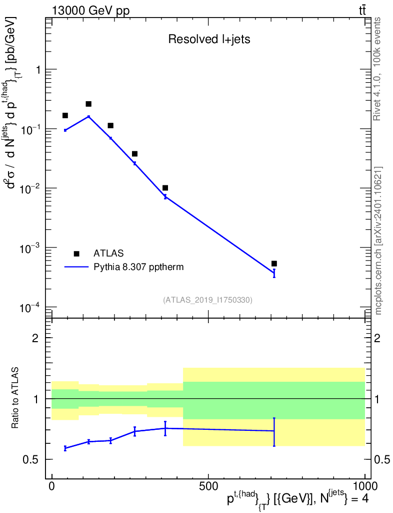 Lines: data, pythia8 8.307 pptherm |