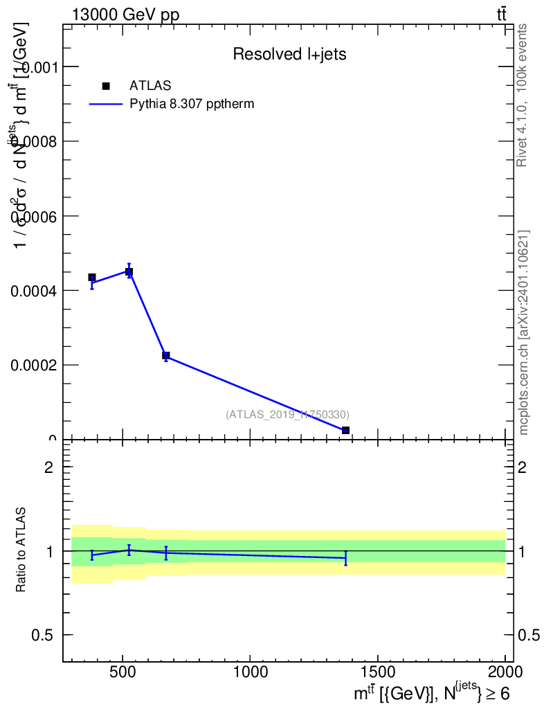 Lines: data, pythia8 8.307 pptherm |