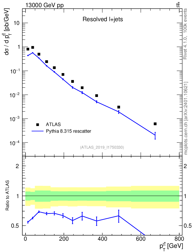 Lines: data, pythia8 8.315 rescatter |