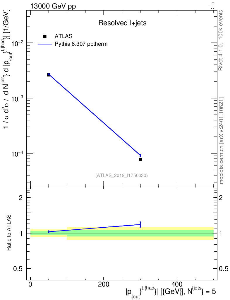 Lines: data, pythia8 8.307 pptherm |