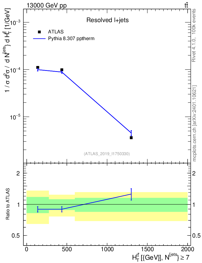 Lines: data, pythia8 8.307 pptherm |
