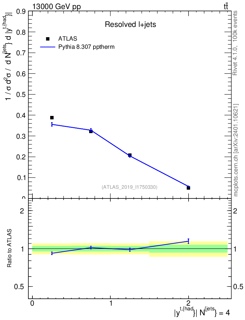 Lines: data, pythia8 8.307 pptherm |