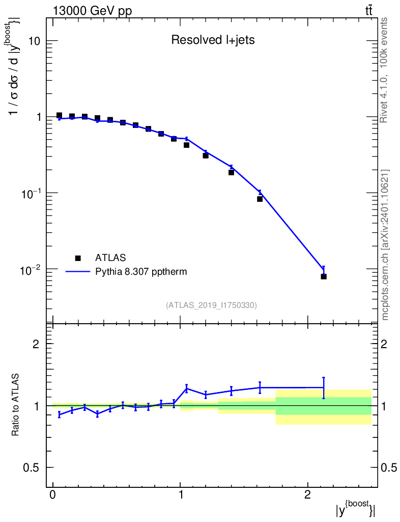 Lines: data, pythia8 8.307 pptherm |