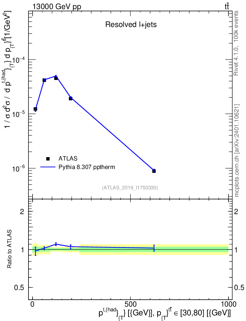 Lines: data, pythia8 8.307 pptherm |
