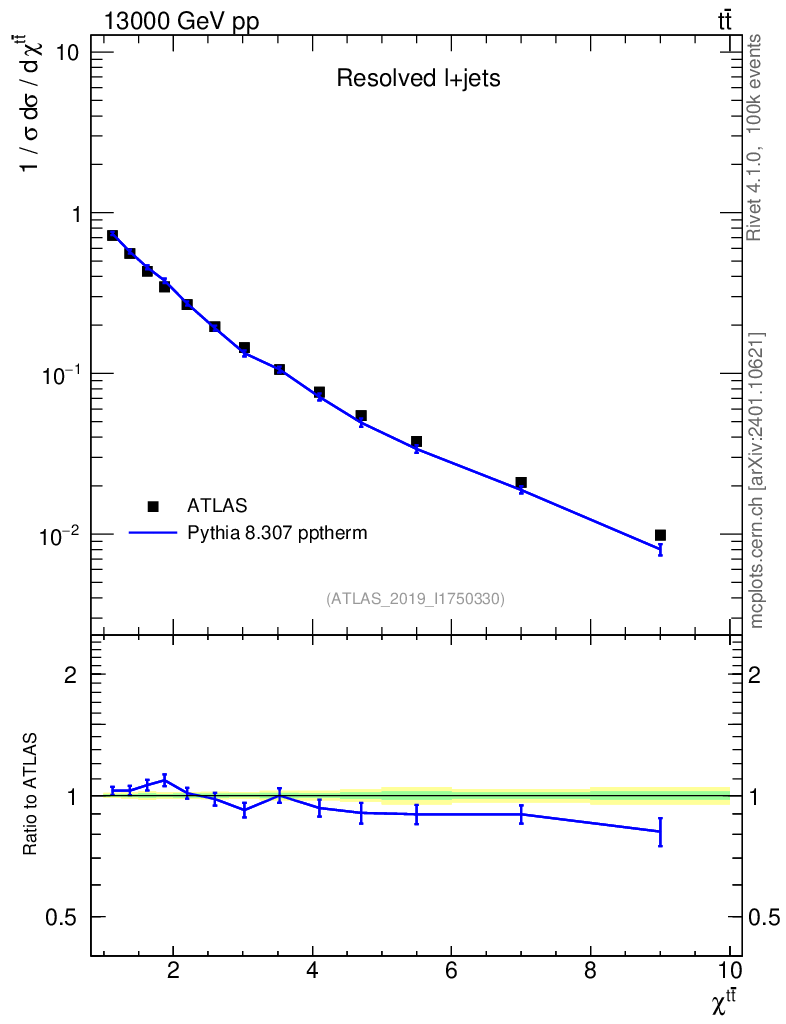 Lines: data, pythia8 8.307 pptherm |
